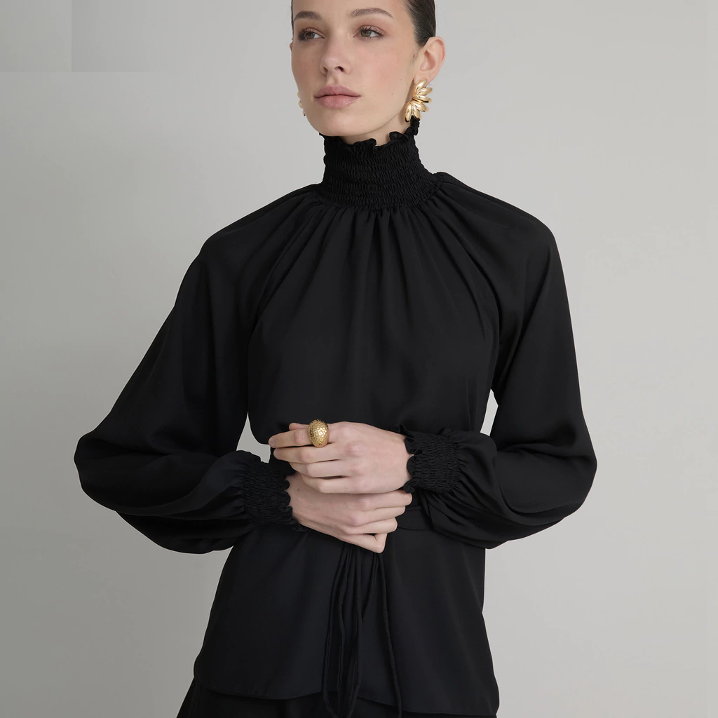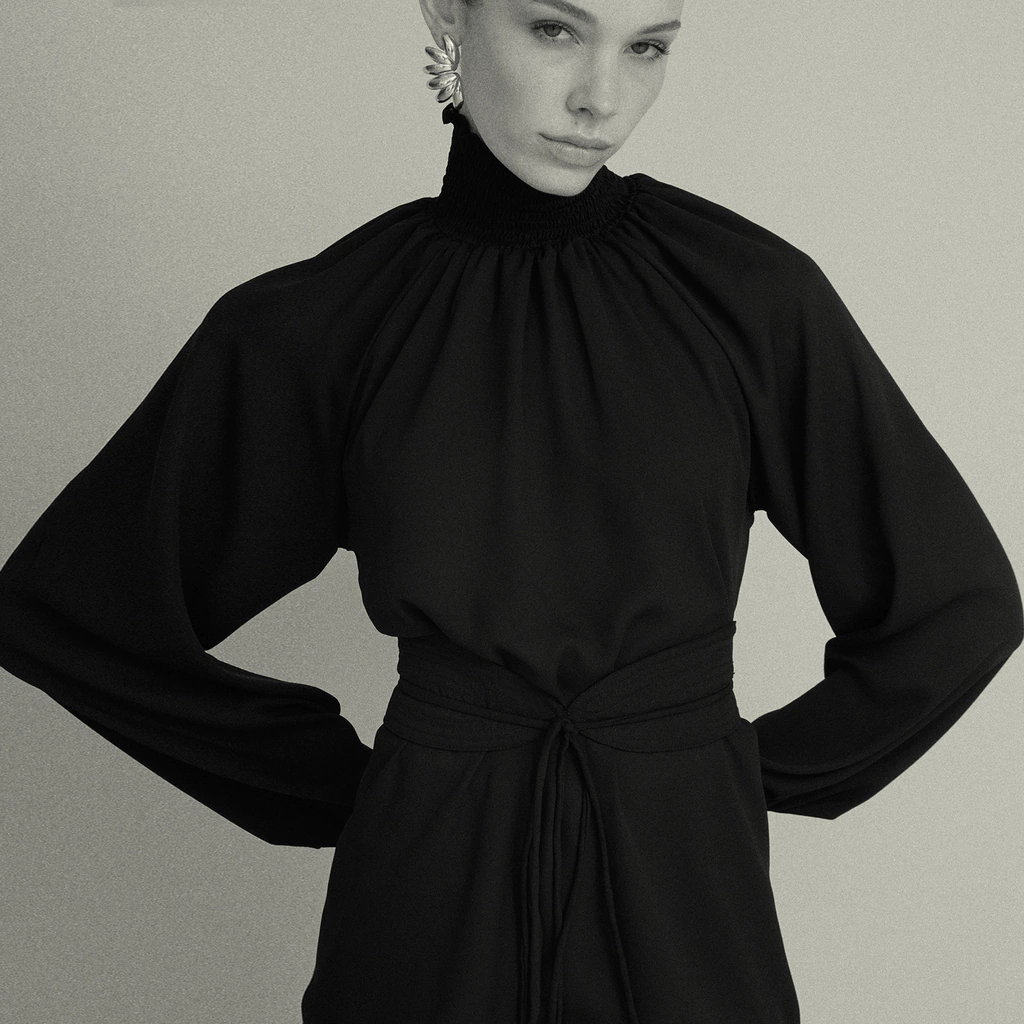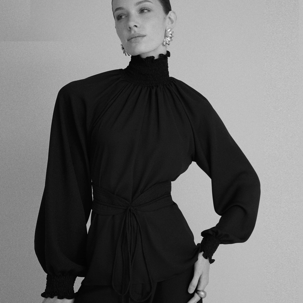 A blusa Sílvia é confeccionada em mousseline preta que confere leveza e fluidez à peça, criando um caimento elegante e delicado. A gola alta drapeada adiciona à peça sofisticação ao mesmo tempo que alonga a silhueta, enquanto que a leve transparência do tecido confere mistério e sofisticação. Suas mangas longas possuem detalhes franzidos nos punhos criando uma harmonia visual com o detalhe da gola. Ideal para diversas ocasiões, formais ou mais casuais com um toque sofisticado.