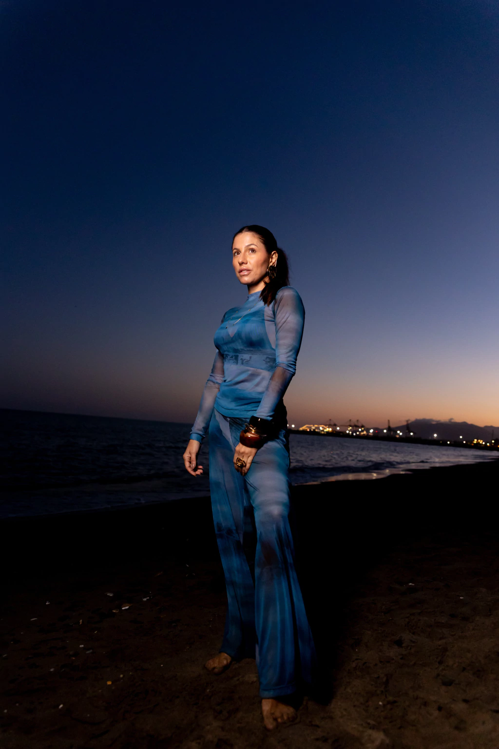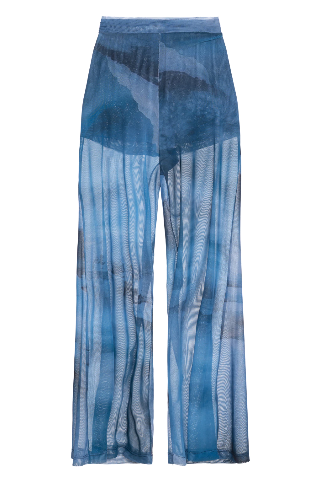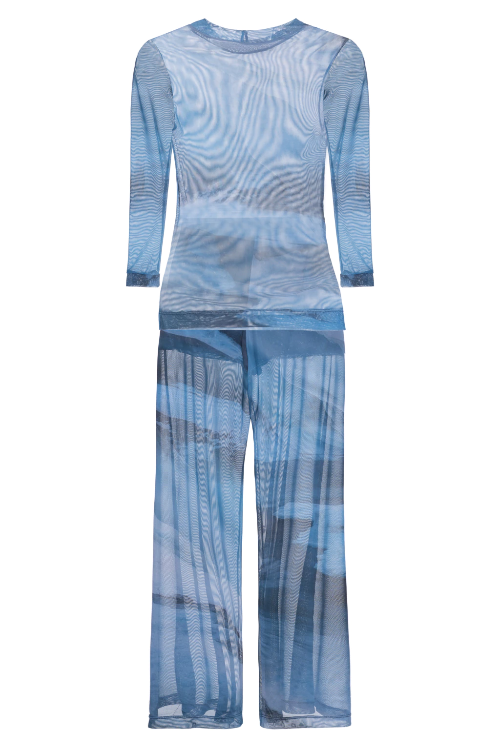 O destaque absoluto é a estampa exclusiva, que reproduz uma fotografia de paisagem em degradê de azuis da fotógrafa Lu Matosinhos.